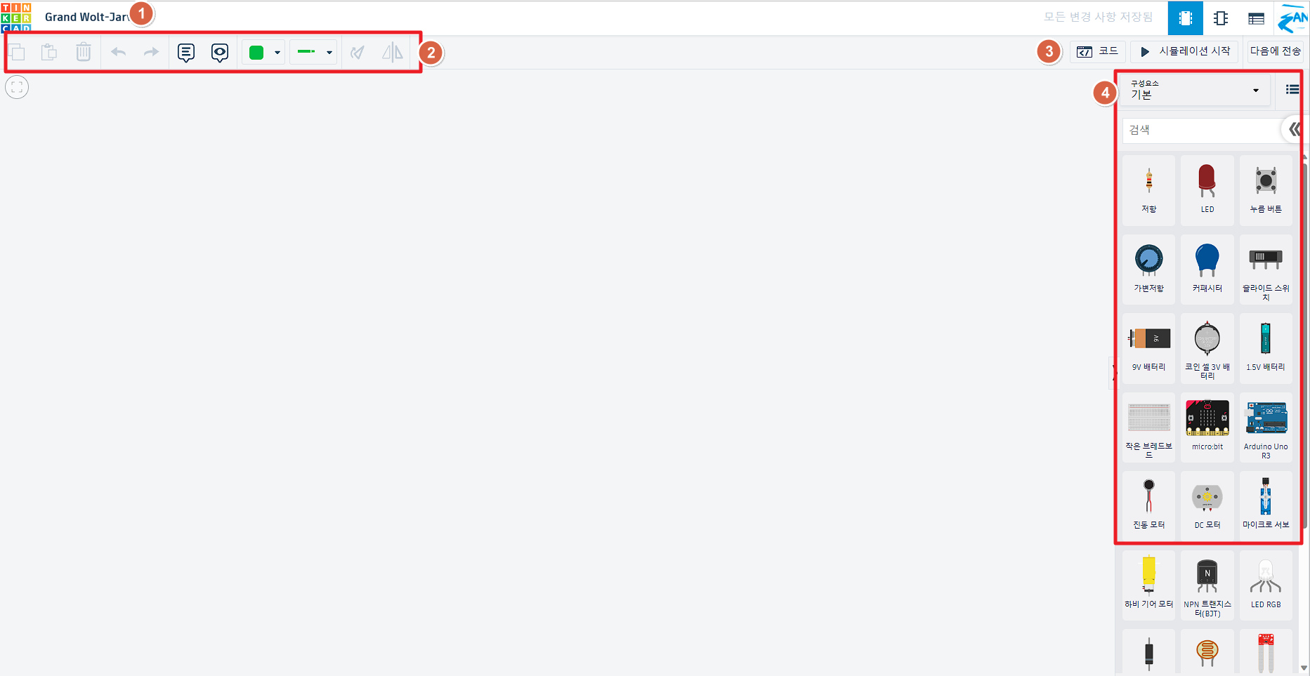 - 코드 / 시뮬레이션 시작 : 회로 제작 후 동작을 위한 코딩작성 및 작성이 완료된 장치의 동작여부를 확인 할 수 있는 시뮬레이션 단축 명령어 등이 있습니다.