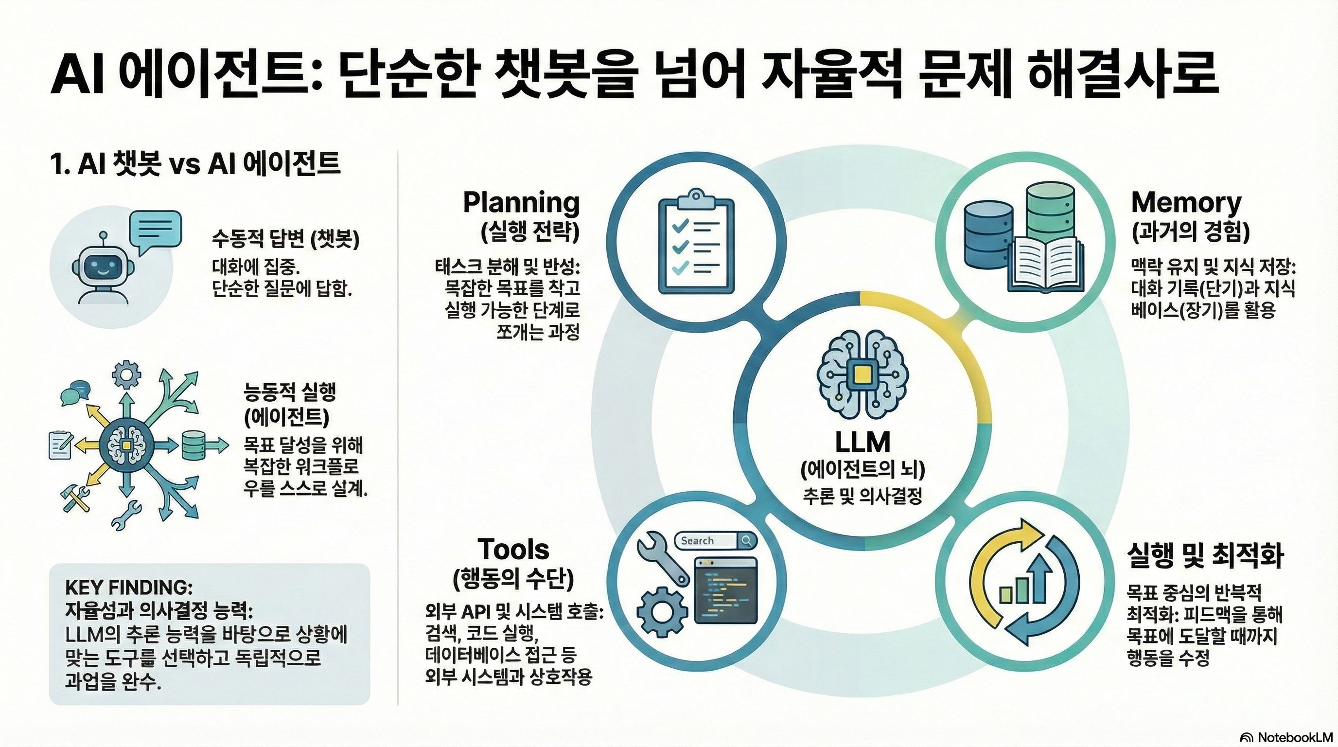 - 자율성: 스스로 목표를 설정하고, 계획을 수립하며, 실행합니다.