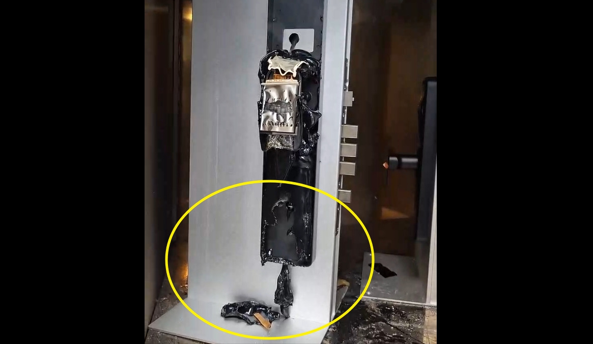이 이미지는 화재 테스트 후 디지털 도어록의 상태를 보여주고 있는데, 왼쪽 패널은 잠금 해제 메커니즘이 작동하는 모습을, 가운데 패널은 손상된 상태를, 오른쪽 패널은 더 심각한 손상을 보여주고 있어요.